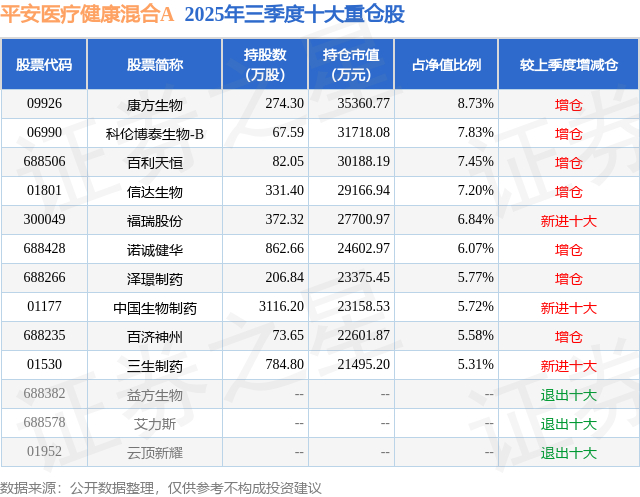 平安医疗健康混合A的前十大重仓股如下: