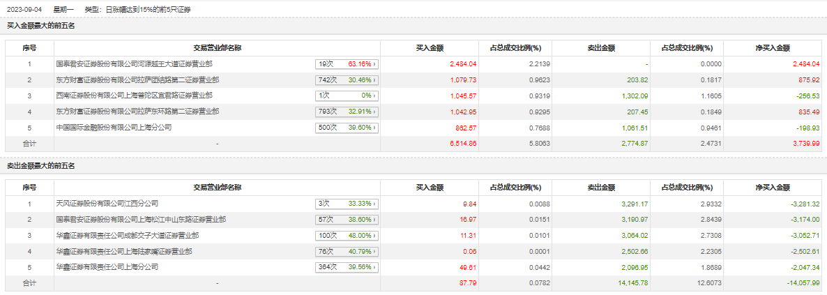 具体来看,国泰君安证券河源越王大道证券营业部、东方财富证券拉萨团结路第二证券营业部分别买入2484.04万元、1079.73万元;天风证券江西分公司、国泰君安证券上海松江中山东路证券营业部分别卖出3291.17万元、3190.97万元。