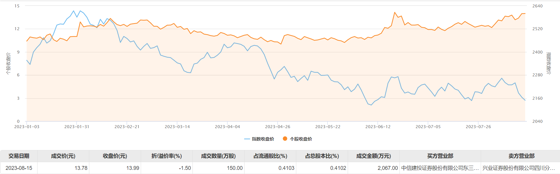 8月15日大宗交易成交150万股,成交额2067万元,占当日总成交额的7.78%,成交价13.78元,较市场收盘价13.99元折价1.5%。