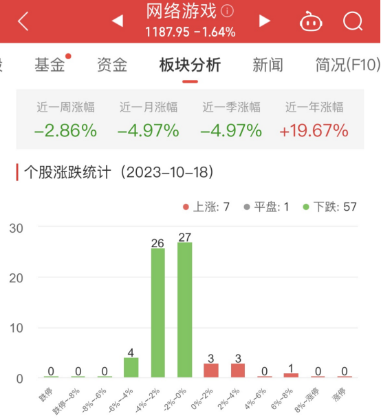 中国经济网北京10月18日讯今日,网络游戏板块整体跌幅1.64%,其中7只股票上涨,1只股票平盘,57只股票下跌。