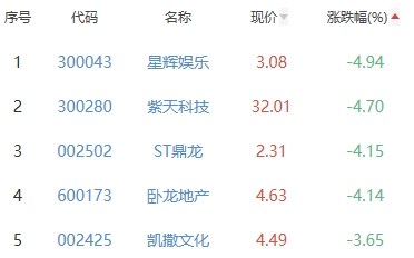 星辉娱乐、紫天科技(维权)、ST鼎龙(维权)、卧龙地产、凯撒文化位列涨幅榜后五位,涨幅分别为-4.94%、-4.70%、-4.15%、-4.14%、-3.65%。