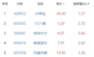 其中,中青宝、ST八菱(维权)、恒信东方、智度股份、凤凰传媒位列板块涨幅前五位,涨幅分别为7.27%、2.72%、2.66%、2.02%、1.36%。