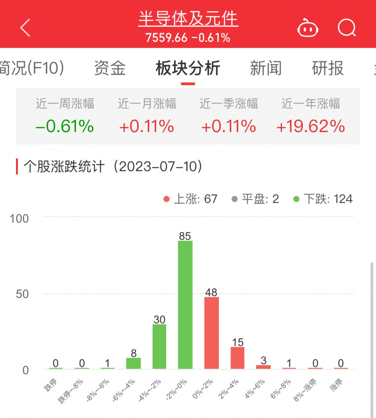 中国经济网北京7月10日讯 今日,半导体及元件板块整体跌幅0.61%,其中67只股票上涨,2只股票平盘,124只股票下跌。