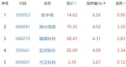 其中,航宇微、海光信息、臻镭科技、圣邦股份、方正科技位列板块涨幅前五位,涨幅分别为6.56%、4.92%、4.31%、4.09%、3.67%。