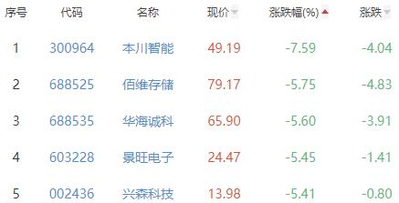 本川智能、佰维储存、华海诚科、景旺电子、兴森科技位列涨幅榜后五位,涨幅分别为-7.59%、-5.75%、-5.60%、-5.45%、-5.41%。