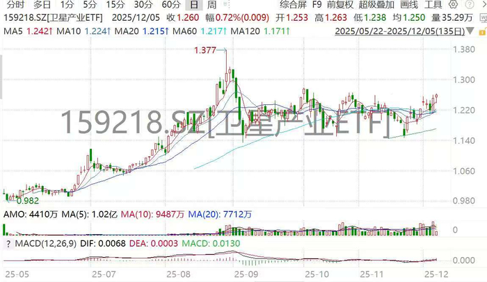 12月5日,卫星产业再度上攻。截至9时54分,表征板块的卫星产业ETF(159218)放量涨0.72%,一度涨0.96%冲击20日新高,铂力特、航宇微、中科星图领衔。交投持续升温,换手率达6.53%,成交额超4400万。