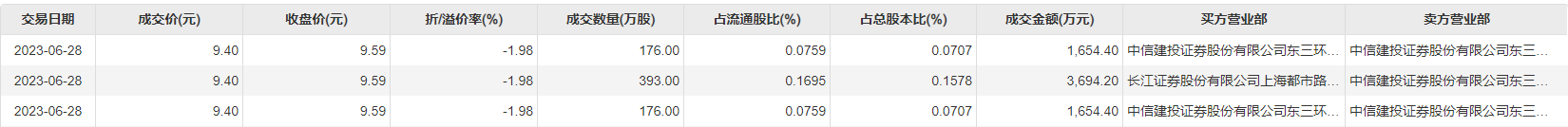 6月28日大宗交易成交745万股,成交额7003万元,占当日总成交额的3.83%,成交价9.4元,较市场收盘价9.59元折价1.98%。