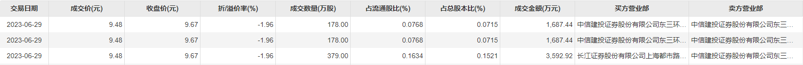6月29日大宗交易成交735万股,成交额6967.8万元,占当日总成交额的5.67%,成交价9.48元,较市场收盘价9.67元折价1.96%。