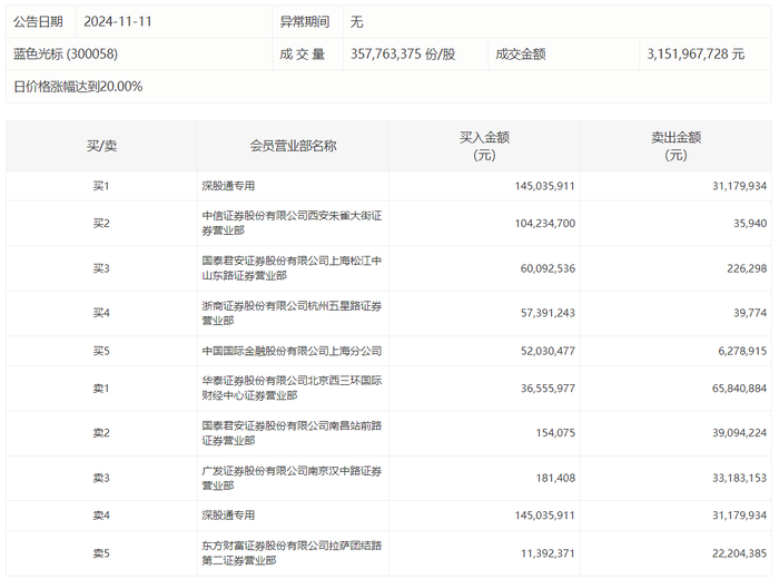 蓝色光标今日涨停,龙虎榜数据显示,上榜营业部席位全天成交6.65亿元,占当日总成交金额比例为21.1%。其中,买入金额为4.67亿元,卖出金额为1.98亿元,合计净买入2.69亿元。