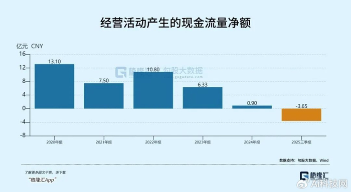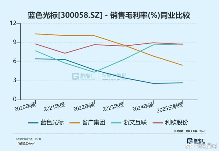 蓝色光标的业绩增长主要得益于出海业务的快速扩张。自2020年以来,海外收入占比从60%提升至83%,成为公司收入的主要来源。然而,出海业务的高议价成本导致毛利率持续下滑,2025年三季度销售毛利率仅为2.66%,净利率不足1%。与此同时,经营现金流出现净流出,前三季度现金流净额为-3.65亿元。这表明,尽管AI业务带来收入增长,公司的盈利模式仍然依赖传统广告投放,利润空间受限。
