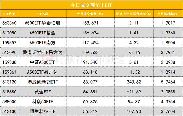 从成交额前十的ETF来看,A500ETF华泰柏瑞(563360)成交额位居首位,A500ETF基金(512050)成交额位居次席。