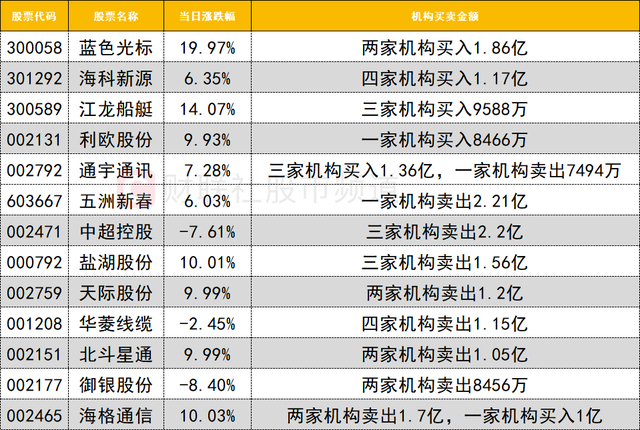今日龙虎榜机构活跃度明显提升,买入方面,AI应用概念股蓝色光标走出2连板,获两家机构买入1.86亿,同时获深股通买入1.56亿。军工人气股江龙船艇获三家机构买入9588万。