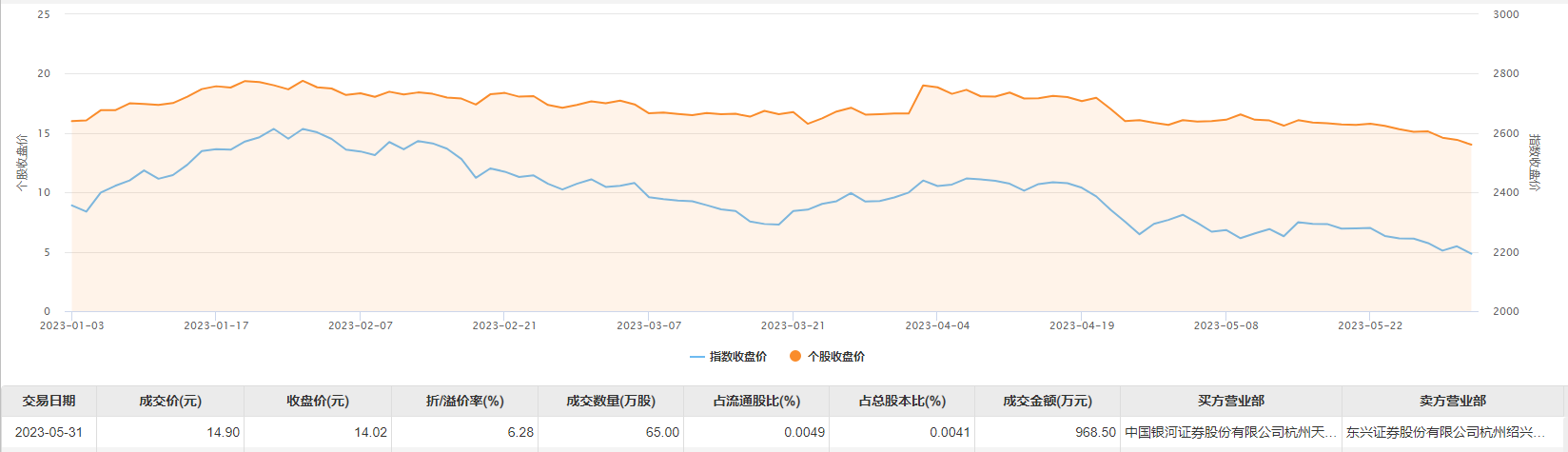 5月31日大宗交易成交65万股,成交额968.5万元,占当日总成交额的0.23%,成交价14.9元,较市场收盘价14.02元溢价6.28%。