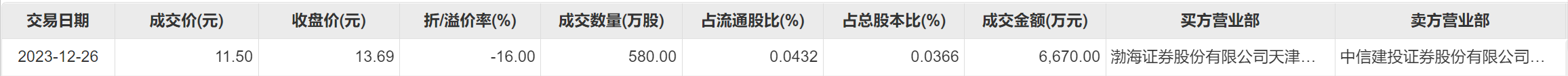 今日大宗交易成交580万股,成交额6670万元,占当日总成交额的5.35%,成交价11.5元,较市场收盘价折价16%。