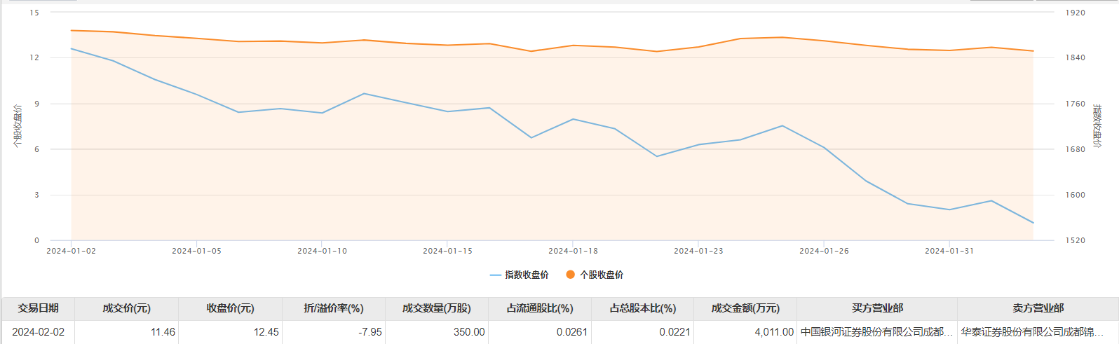 2月2日大宗交易成交350万股,成交额4011万元,占当日总成交额的1.31%,成交价11.46元,较市场收盘价折价7.95%。