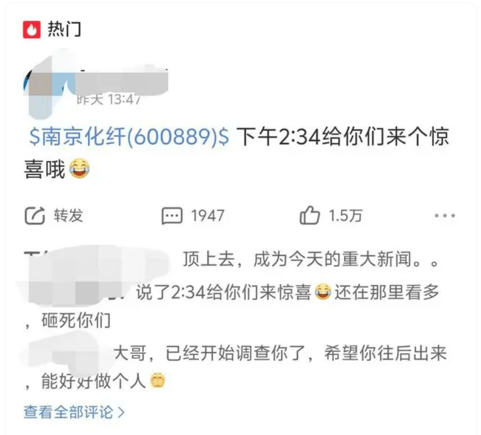 最近两天,南京化纤(维权)、中通客车等个股的“离奇预言”持续发酵,5月21日沪深交易所纷纷出手对相关账户采取暂停交易的监管措施。