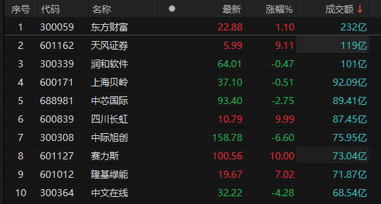 东方财富成交额超200亿元 天风证券、润和软件超100亿元