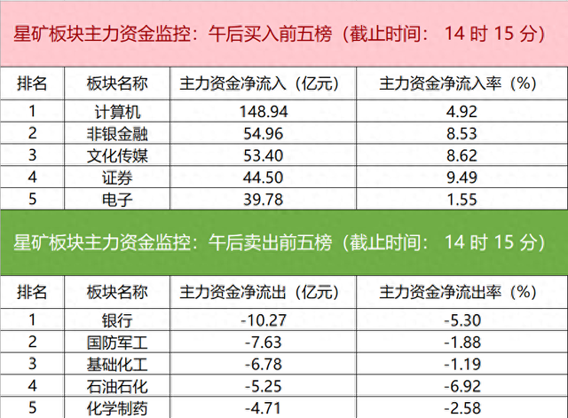 【主力资金监控:东方财富净买入超20亿】财联社3月6日电,财联社星矿数据显示,今日主力资金净流入计算机、非银金融、文化传媒等板块,净流出银行、国防军工、基础化工等板块,其中计算机板块净流入超148亿元。个股方面,东方财富上涨,主力资金净买入20.10亿元位居首位,汉得信息、蓝色光标、赛力斯获主力资金净流入居前;拓维信息遭净卖出超8亿元位居首位,北京君正、农业银行、协创数据主力资金净流出额居前。