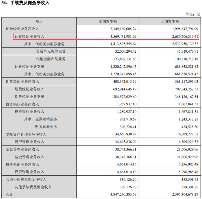 从营收构成来看,利息净收入14.31亿元,同比增长39.38%;手续费及佣金净收入占到大头,上半年为38.47亿元,同比增长60.62%,占到营业总收入的一半以上,主要因证券经纪业务收入同比增加。证券经纪业务净收入为33.49亿元,同比增长67.56%,在全部手续费及佣金净收入中占到87.05%,其中绝大部分是代理买卖证券业务。