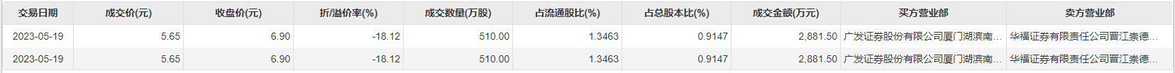 5月19日大宗交易成交1020万股,成交额5763万元,占当日总成交额的22.1%,成交价5.65元,较市场收盘价6.9元折价18.12%。