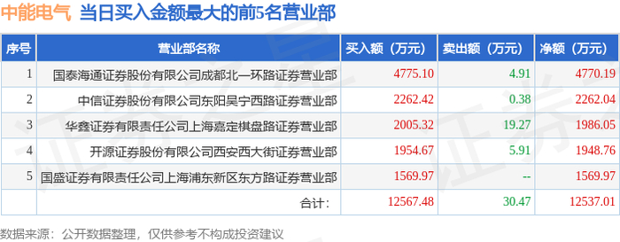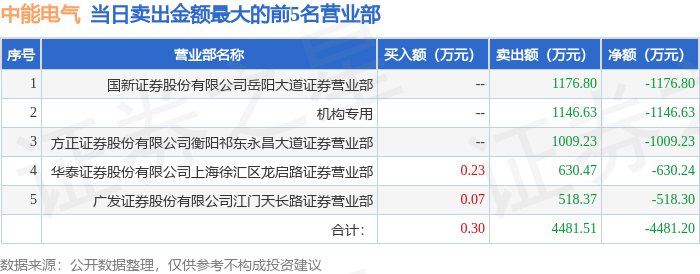 11月4日中能电气(300062)龙虎榜数据:机构净卖出1146.63万元