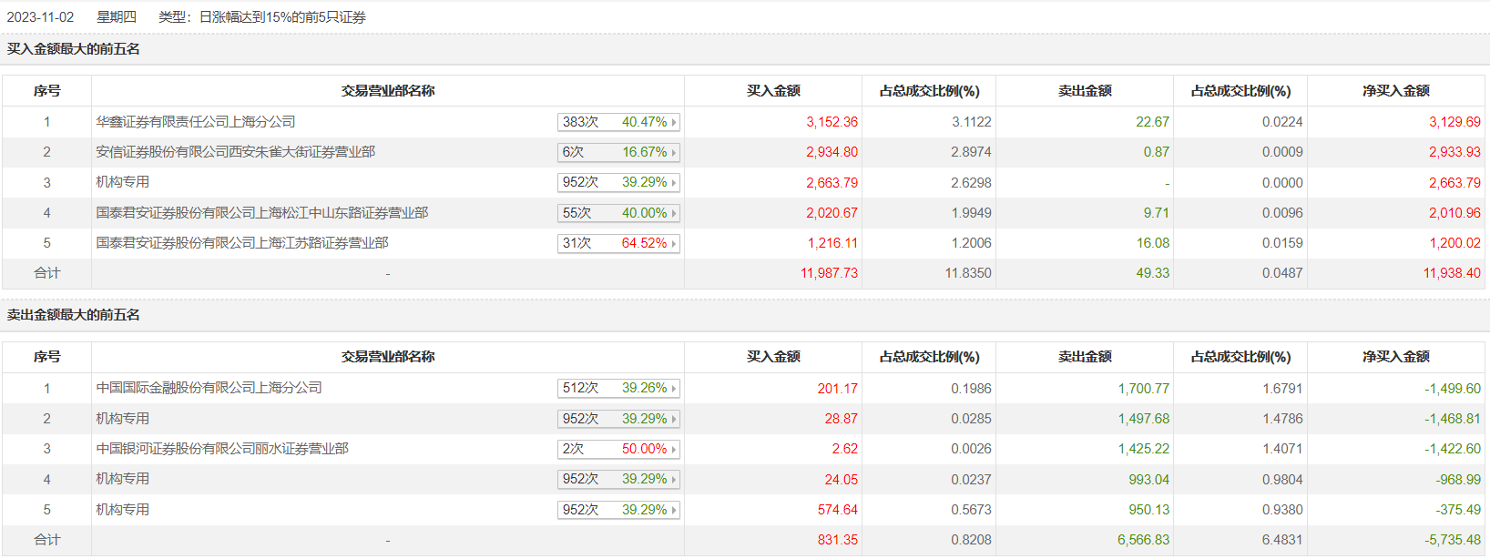 具体来看,机构买入3291.35万元,卖出3440.85万元,合计净卖出149.5万元。此外,知名游资现身龙虎榜,章盟主(国泰君安证券股份有限公司上海江苏路证券营业部)净买入1200.02万元。此外,华鑫证券上海分公司、安信证券西安朱雀大街证券营业部分别买入3152.36万元、2934.80万元;中国国际金融上海分公司、中国银河证券丽水证券营业部分别卖出1700.77万元、1425.22万元。