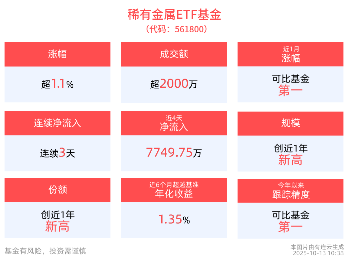 场内ETF方面,截至2025年10月13日10:38,中证稀有金属主题指数(930632)强势上涨1.10%,成分股银河磁体(300127)上涨13.35%,三川智慧(300066)上涨9.56%,北方稀土(600111)上涨6.90%,金力永磁(300748),有研新材(600206)等个股跟涨。稀有金属ETF基金(561800)上涨1.12%。拉长时间看,截至2025年10月10日,稀有金属ETF基金近2周累计上涨12.02%,涨幅排名可比基金第一。