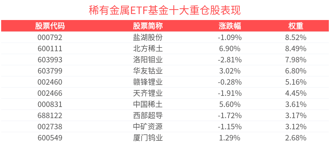 数据显示,截至2025年9月30日,中证稀有金属主题指数(930632)前十大权重股分别为北方稀土(600111)、洛阳钼业(603993)、华友钴业(603799)、盐湖股份(000792)、赣锋锂业(002460)、天齐锂业(002466)、中国稀土(000831)、中矿资源(002738)、盛和资源(600392)、西部超导(688122),前十大权重股合计占比59.91%。