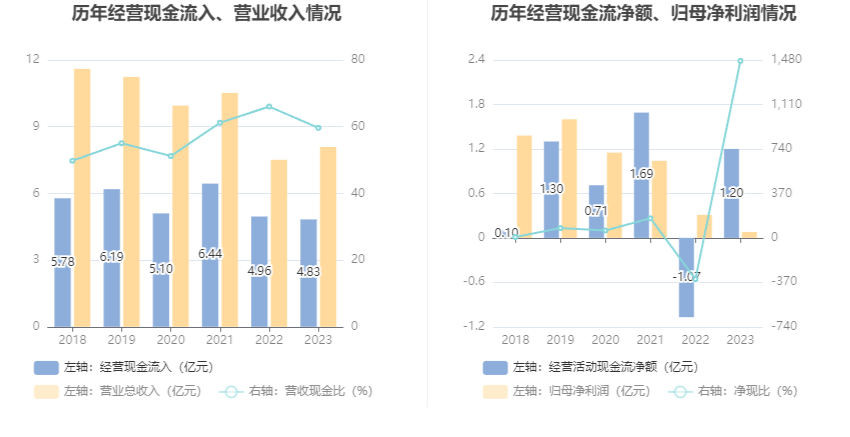 2023年,公司营业收入现金比为59.65%,净现比为1472.91%。