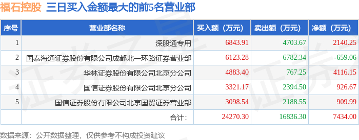 11月3日福石控股(300071)龙虎榜数据:北向资金净买入2140.25万元(3日)