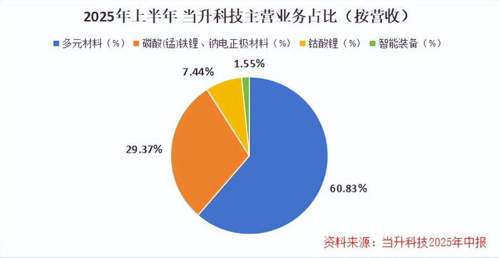 目前,当升科技的主营业务涵盖多元材料、磷酸(锰)铁锂、钠电正极材料及钴酸锂等四大方向,2025年上半年,多元材料以60.83%的营收占比稳居主力。