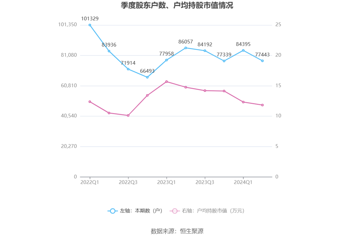 筹码集中度方面,截至2024年上半年末,公司股东总户数为7.74万户,较一季度末下降了6952户,降幅8.24%;户均持股市值由一季度末的12.32万元下降至11.83万元,降幅为3.98%。