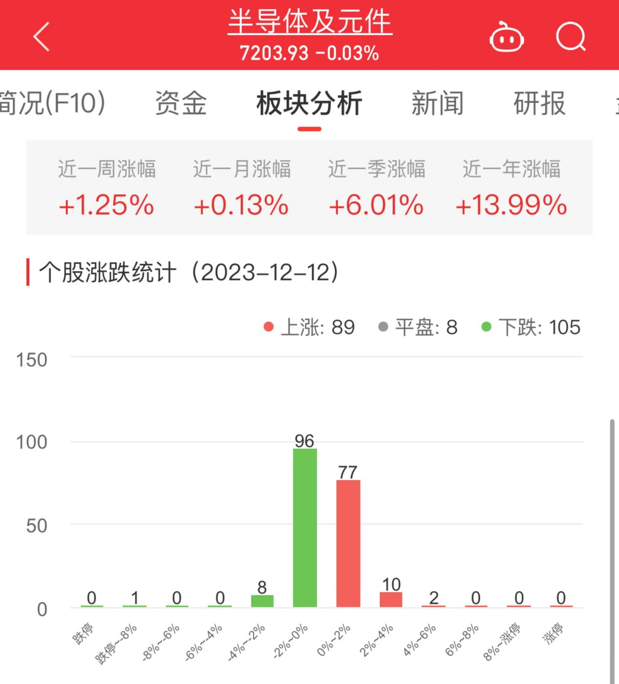 中国经济网北京12月12日讯 今日,半导体及元件板块整体跌幅0.03%,其中89只股票上涨,8只股票平盘,105只股票下跌。