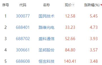 其中,国民技术、路维光电、盛科通信、圣邦股份、恒玄科技位列板块涨幅前五位,涨幅分别为5.45%、4.73%、3.93%、3.57%、3.48%。