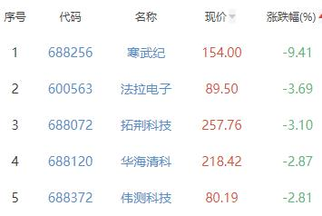 寒武纪、法拉电子、拓荆科技、华海清科、伟测科技位列涨幅榜后五位,涨幅分别为-9.41%、-3.69%、-3.10%、-2.87%、-2.81%。