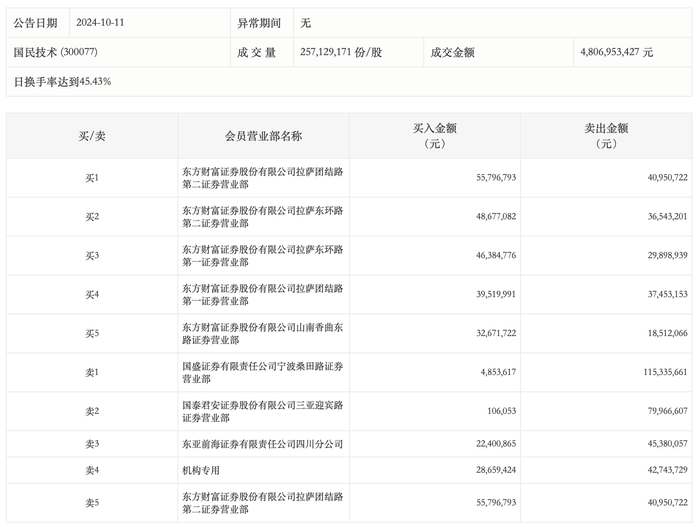 龙虎榜丨国民技术今日跌12.91%,一机构净卖出1408.43万元