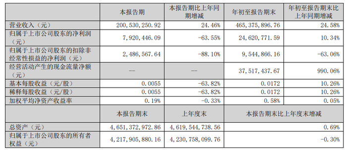 报告显示,数码视讯公司前三季度营业收入为4.65亿元,同比增长24.58%;归母净利润为2462.08万元,同比增长10.34%;扣非归母净利润为954.49万元,同比下降63.06%;基本每股收益0.02元。