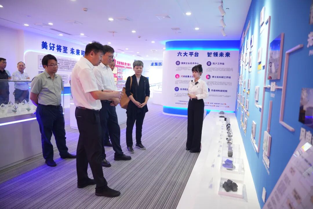 在讲解员的引导下,费鹏一行参观了展厅内各个展示区域,通过观看企业宣传片、产品展示等多种形式,全面了解了公司在新能源新材料领域的战略布局、创新成果及发展历程。