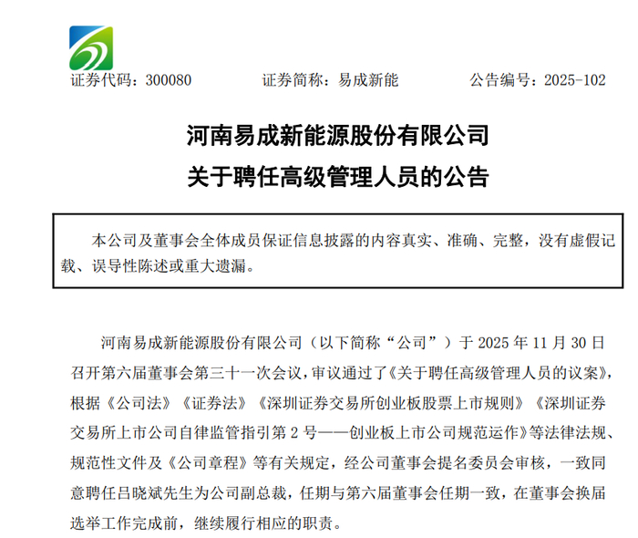 公告显示,河南易成新能源股份有限公司当日召开第六届董事会第三十一次会议,审议通过《关于聘任高级管理人员的议案》。经公司董事会提名委员会审核,一致同意聘任吕晓斌为公司副总裁,任期与第六届董事会任期一致,在董事会换届选举工作完成前,继续履行相应职责。
