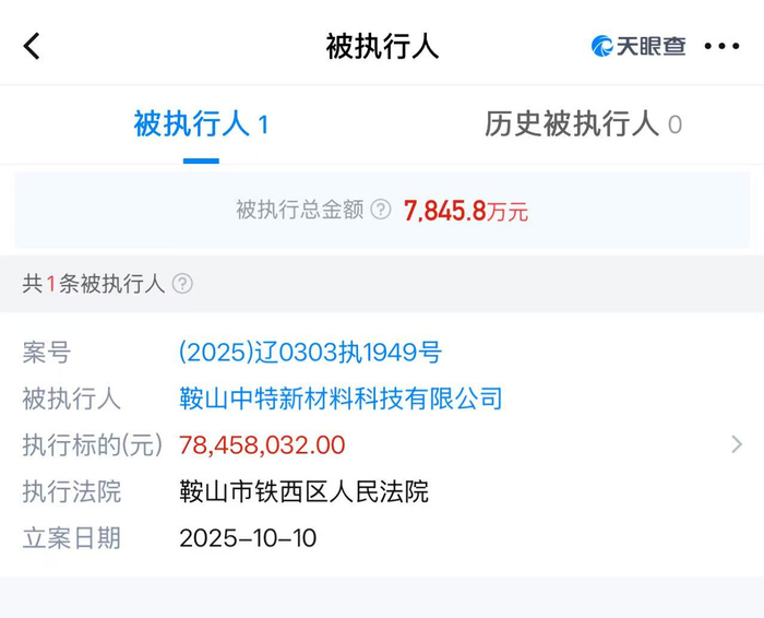 不过,当前,鞍山中特已成为被执行人。天眼查数据显示,2025年10月10日,鞍山中特新材料科技有限公司新增一条被执行人信息,执行标的高达7845.8万元,执行法院为鞍山市铁西区人民法院。