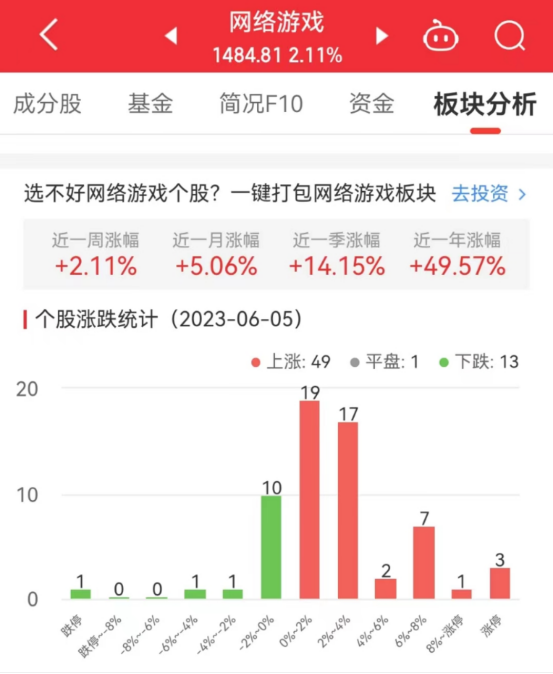 中国经济网北京6月5日讯今日,网络游戏板块整体涨幅2.11%,其中49只股票上涨,1只股票平盘,13只股票下跌。