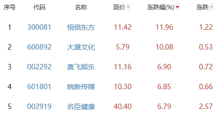 其中,恒信东方、大晟文化、奥飞娱乐、皖新传媒、名臣健康位列板块涨幅前五位,涨幅分别为11.96%、10.08%、6.90%、6.85%、6.79%。