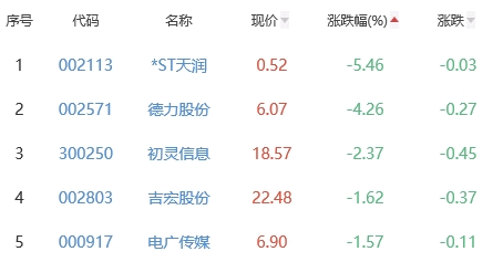 *ST天润、德力股份、初灵信息、吉宏股份、电广传媒位列涨幅榜后五位,涨幅分别为-5.46%、-4.26%、-2.37%、-1.62%、-1.57%。