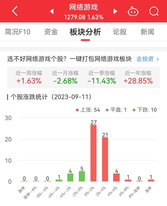 中国经济网北京9月11日讯今日,网络游戏板块整体涨幅1.63%,其中54只股票上涨,1张股票平盘,10只股票下跌。