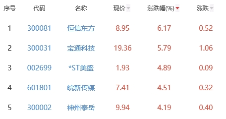 其中,恒信东方、宝通科技、*ST美盛(维权)、皖新传媒、神州泰岳位列板块涨幅前五位,涨幅分别为6.17%、5.79%、4.89%、4.51%、4.19%。