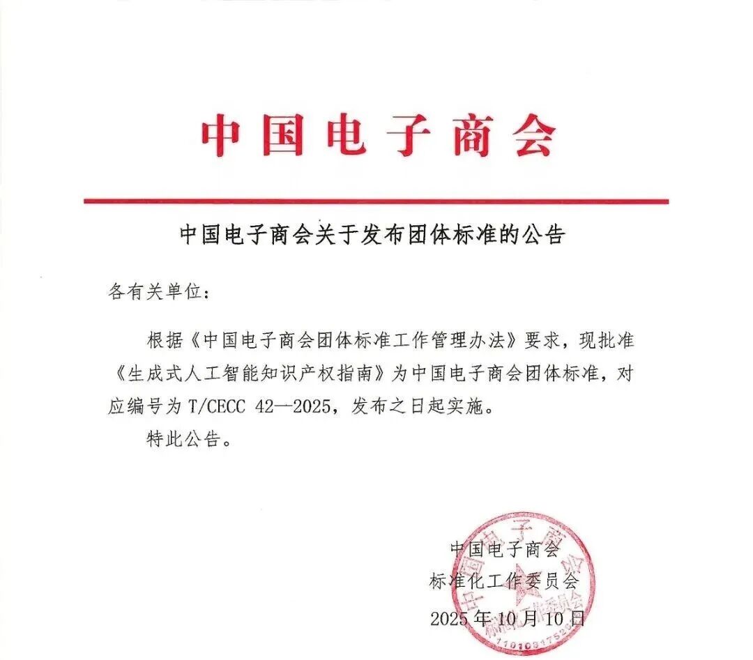 近日,中国电子商会正式发布聚焦生成式人工智能领域的知识产权团体标准——《生成式人工智能知识产权指南》(T/CECC 42-2025)。该团体标准作为“标准化+市场监管”团体标准典型案例,于10月10日起正式实施,并在海淀区第56届“世界标准日”主题活动暨第四届标准创新大会上亮相。