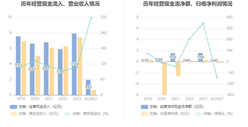 2024年第一季度,公司营业收入现金比为298.07%,净现比为-202.86%。