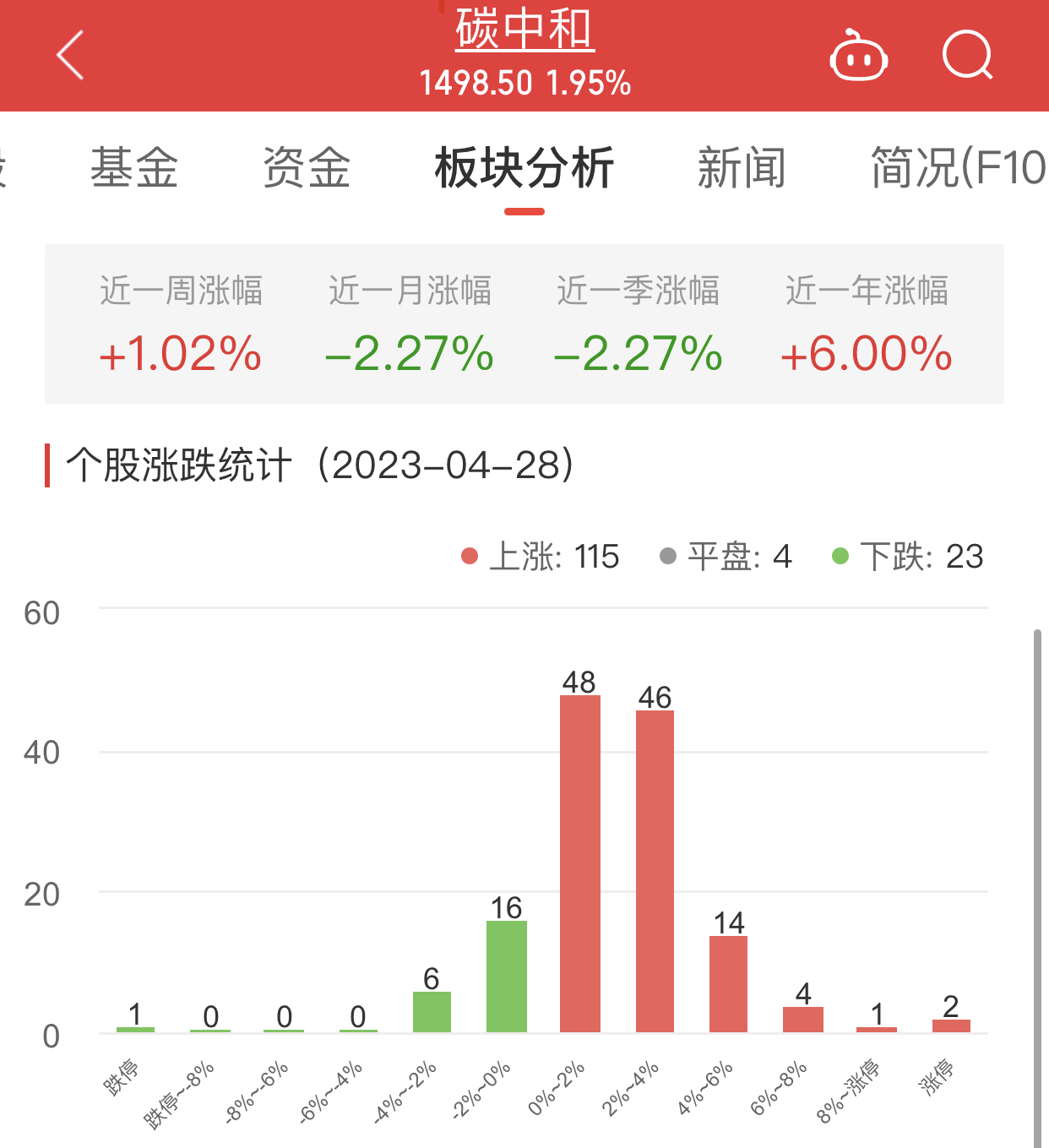 中国经济网北京4月28日讯 今日,碳中和板块整体涨幅1.95%,其中115只股票上涨,4只股票平盘,23只股票下跌。