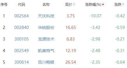天沃科技、华统股份、龙源技术、凯美特气、百川畅银位列涨幅榜后五位,涨幅分别为-10.07%、-3.42%、-2.98%、-2.48%、-2.35%。