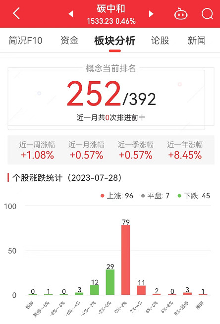 中国经济网北京7月28日讯 今日,碳中和板块整体涨幅0.46%,其中,96只股票上涨,7只股票平盘,45只股票下跌。
